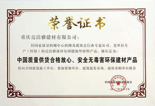 重慶亮潔雅建材有限公司是一家集科研,開發,生產,銷售,工程設計與施工為一體的大型專業化涂料公司,具有國家專業建材承包施工資質,擁有一批高素質的工程技術人員和經驗豐富的施工隊伍,全方位為您提供產品及工程服務。 本公司主營環氧地坪涂料,環氧自流坪(無溶劑)地坪涂料,丙稀酸 地坪涂料,環氧防靜電地坪涂料,環氧固化劑,兼營外墻漆等產品,現已通過ISO9001:2000國際質量認證,并廣泛運用于:停車…